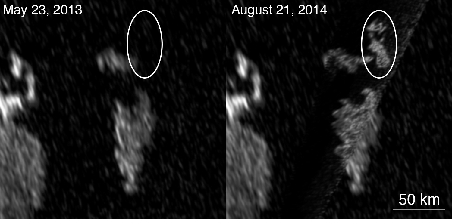 Nel corso degli anni, Cassini ha identificato una manciata di strutture simili, una delle quali è situata nel Mare Kraken. Secondo gli scienziati, queste strutture sono le prime prove della presenza di processi attivi nei mari e laghi di Titano. La loro natura transiente dimostra come i bacini di Titano siano ambienti tutt’altro che stagnanti.