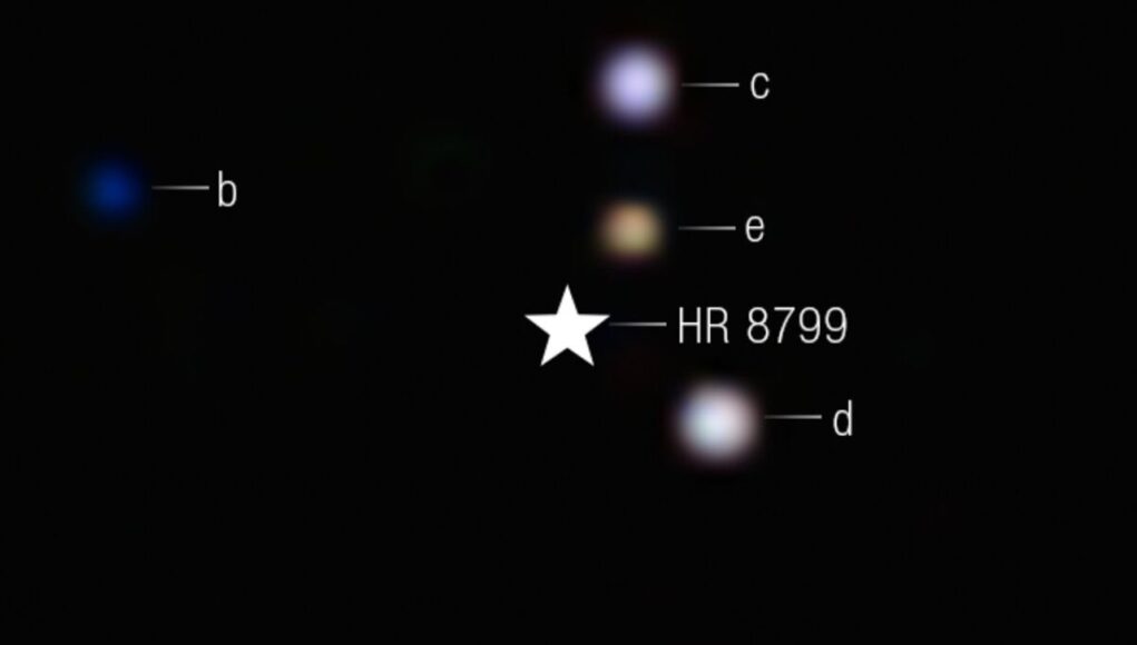 L’immagine è stata ottenuta utilizzando diversi filtri della fotocamera nel vicino infrarosso NIRCam di Webb, che rivelano le differenze intrinseche tra i pianeti. Un simbolo a forma di stella indica la posizione della stella madre, HR 8799, il cui bagliore è stato oscurato da un coronografo per permettere di osservare meglio i pianeti circostanti.