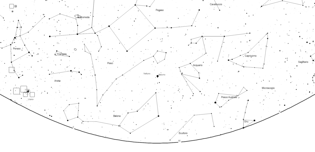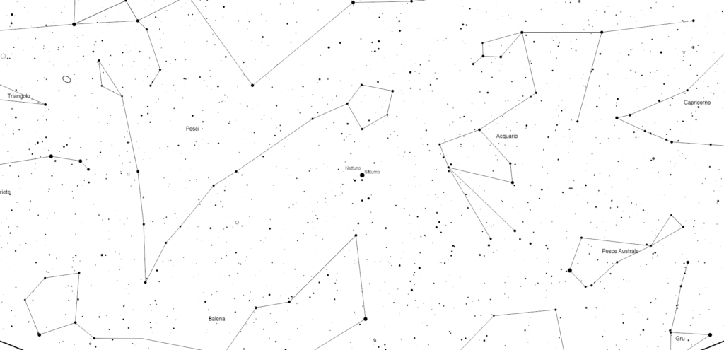 Nettuno, così come Urano, non è identificabile a occhio nudo, e anche con un telescopio non sempre è facile riconoscerlo tra le stelle. Lo troveremo nei Pesci, insieme a Saturno, a una distanza dalla Terra di 28,9 AU, avrà una dimensione apparente di 2,4” d’arco e si mostrerà con una magnitudine di 7,81 (contro il massimo della magnitudine di 7,96 di marzo)