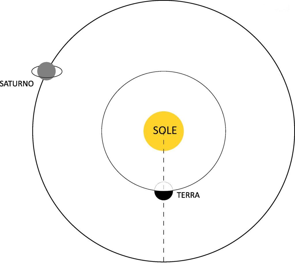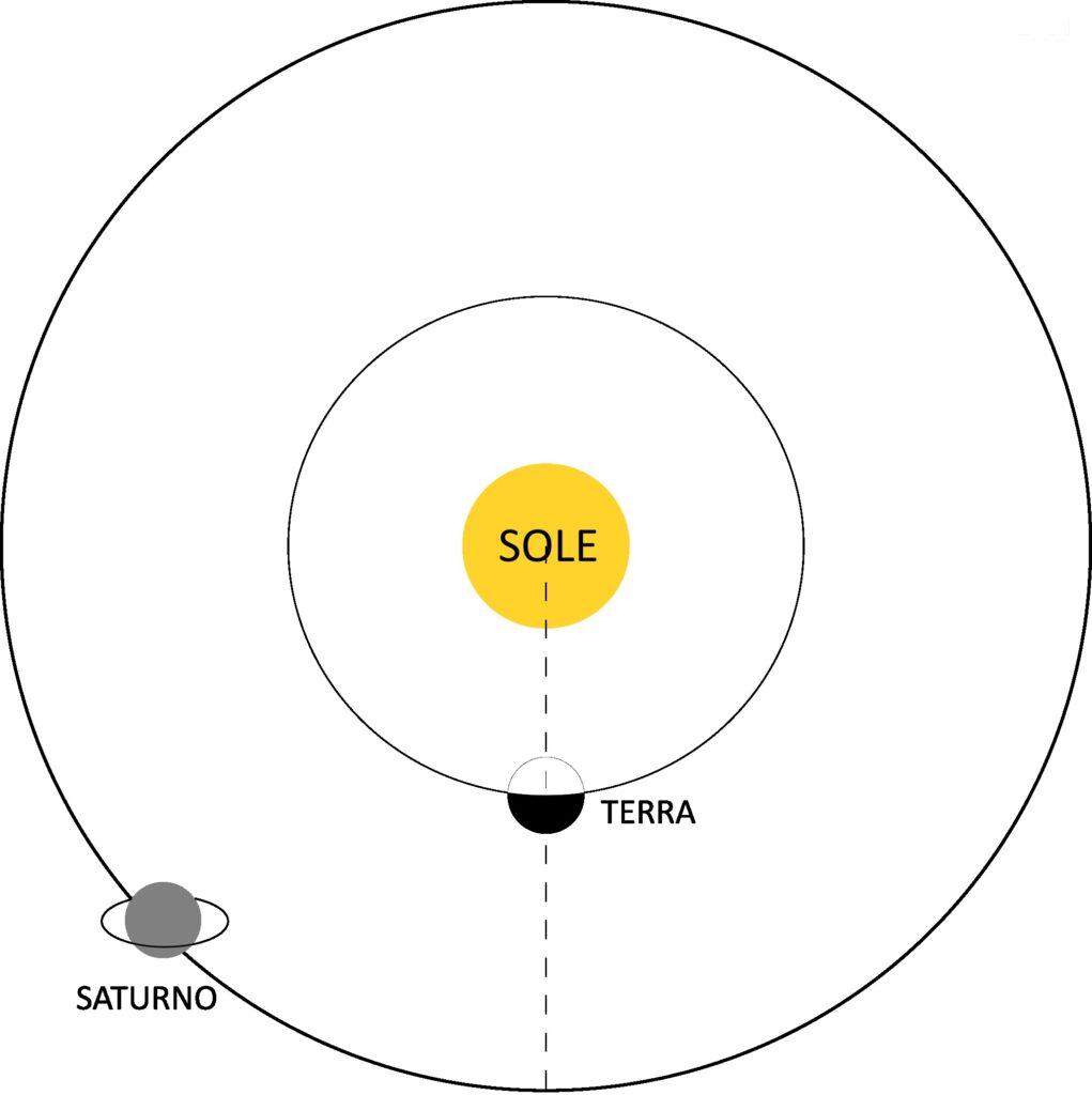 Anzitutto, partiamo dall’assunto ovvio che tutti i pianeti del Sistema solare percorrono la loro orbita (ellittica, più o meno eccentrica) intorno al Sole con tempi molto differenti l’uno dall’altro. La Terra, come sappiamo, impiega 365,2564 giorni solari medi (1 anno), mentre Saturno completa la sua orbita in 29,447 anni terrestri. È chiaro che quindi le posizioni della Terra e di Saturno reciproche e rispetto al Sole differiscono nel tempo e cambiano con tempi diversi.