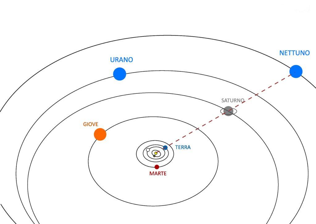 Figura 5. L’immagine mostra la disposizione reale dei pianeti esterni del Sistema solare, fino a Saturno, il giorno dell’opposizione.