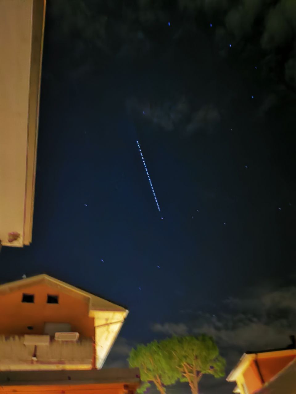 Ripresi con un smartphone Huawei P30 Pro puntando verso ovest, i satelliti Starlink viaggiano da ovest a SEE
