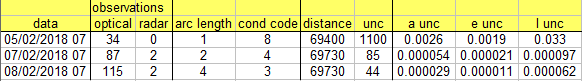 Un ultimo aspetto da sottolineare è il fatto che, contrariamente alla maggior parte degli incontri ravvicinati con oggetti da poco scoperti, in questo caso c’è stato un preavviso sufficiente ad organizzare numerose osservazioni anche con il radar e questo ha permesso di affinare grandemente la precisione della sua traiettoria e dell’orbita, come dimostrato nella tabella seguente (che verrà aggiornata nei prossimi giorni); come si vede, l’errore sulla distanza minima si è ridotto del 96% in 3 giorni e anche i principali parametri orbitali sono migliorati di 2-3 ordini di grandezza!