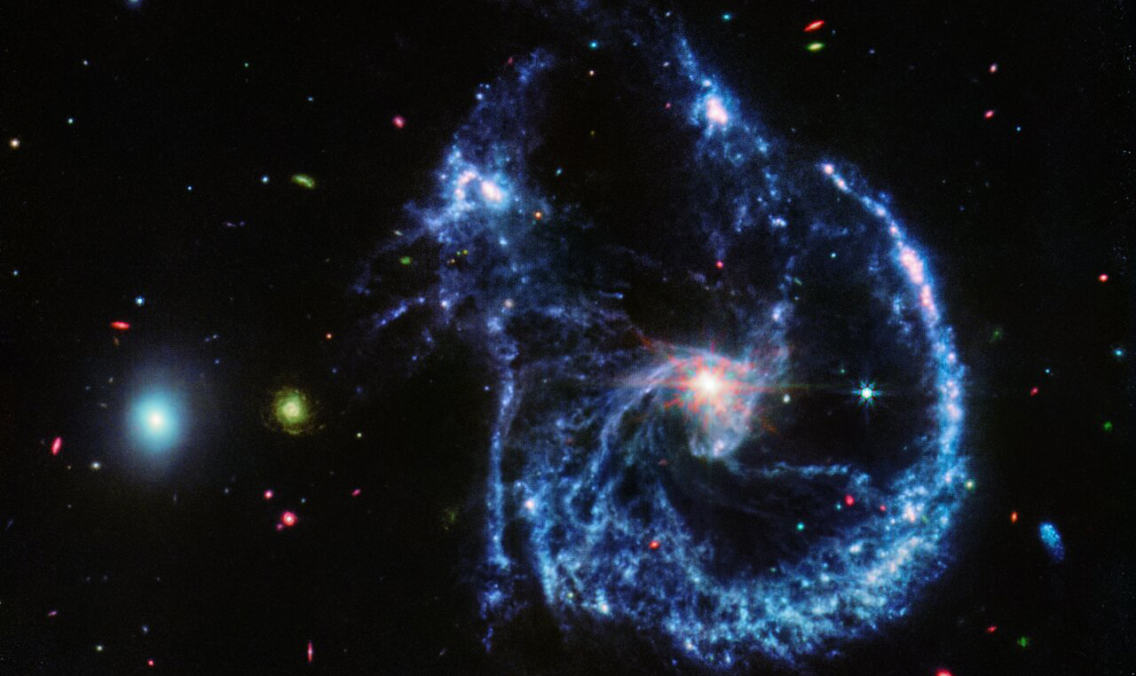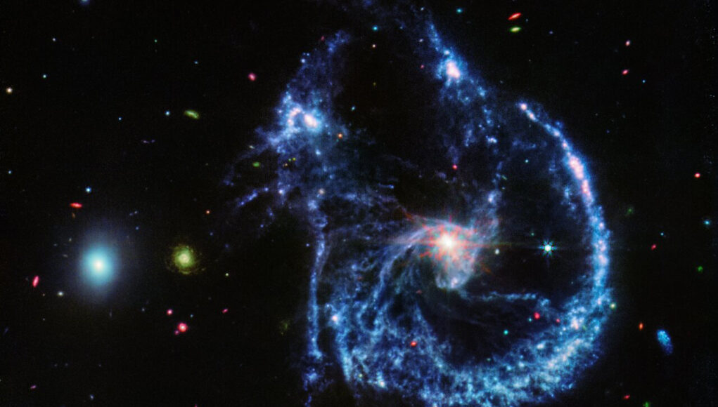 Questa regione è molto simile alla galassia Cartwheel, una delle prime galassie interagenti osservate da Webb. Arp 107 potrebbe essersi rivelata molto simile nell’aspetto alla Cartwheel, ma poiché la galassia ellittica più piccola ha avuto una collisione decentrata anziché un colpo diretto, la galassia a spirale se l’è cavata con solo i suoi bracci a spirale disturbati.