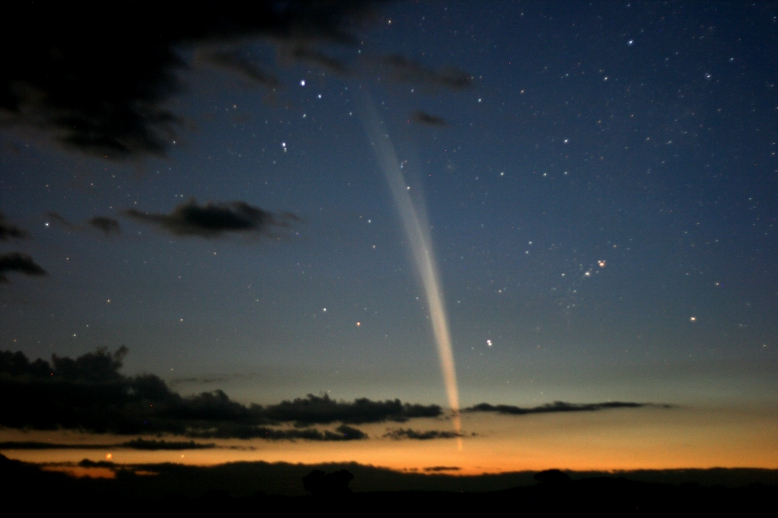 E’ emozionante vedere spuntare dall’orizzonte rosato questo pennacchio colorato ricco di tenui sfumature e pensare che stiamo osservando polveri e gas persi da una piccola e anonima cometa che un giorno ha deciso di regalarsi un grande momento di gloria mostrandosi così bella agli abitanti di un pianeta chiamato Terra.