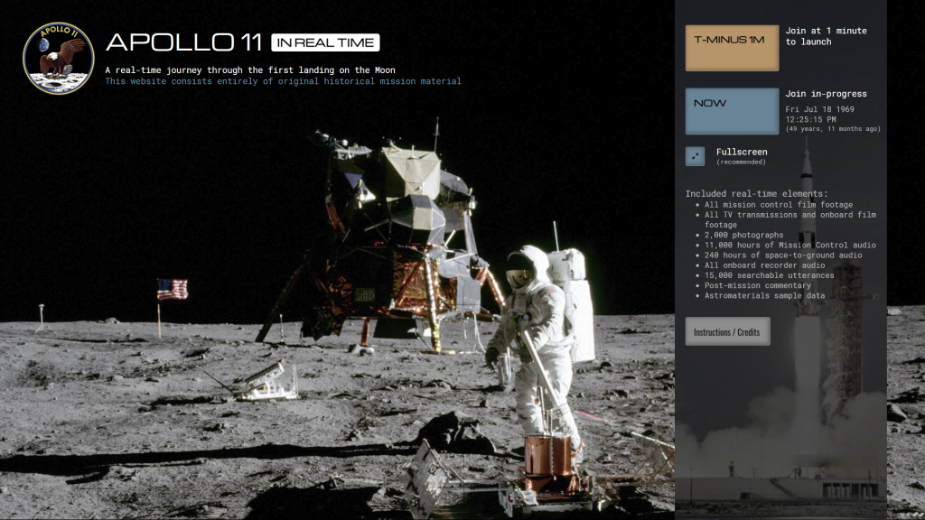 Sul sito apolloinrealtime.org possiamo tornare indietro di 50 anni ed entrare direttamente nell’azione in tempo reale della prima missione che ha portato l’uomo a scendere sul suolo lunare.