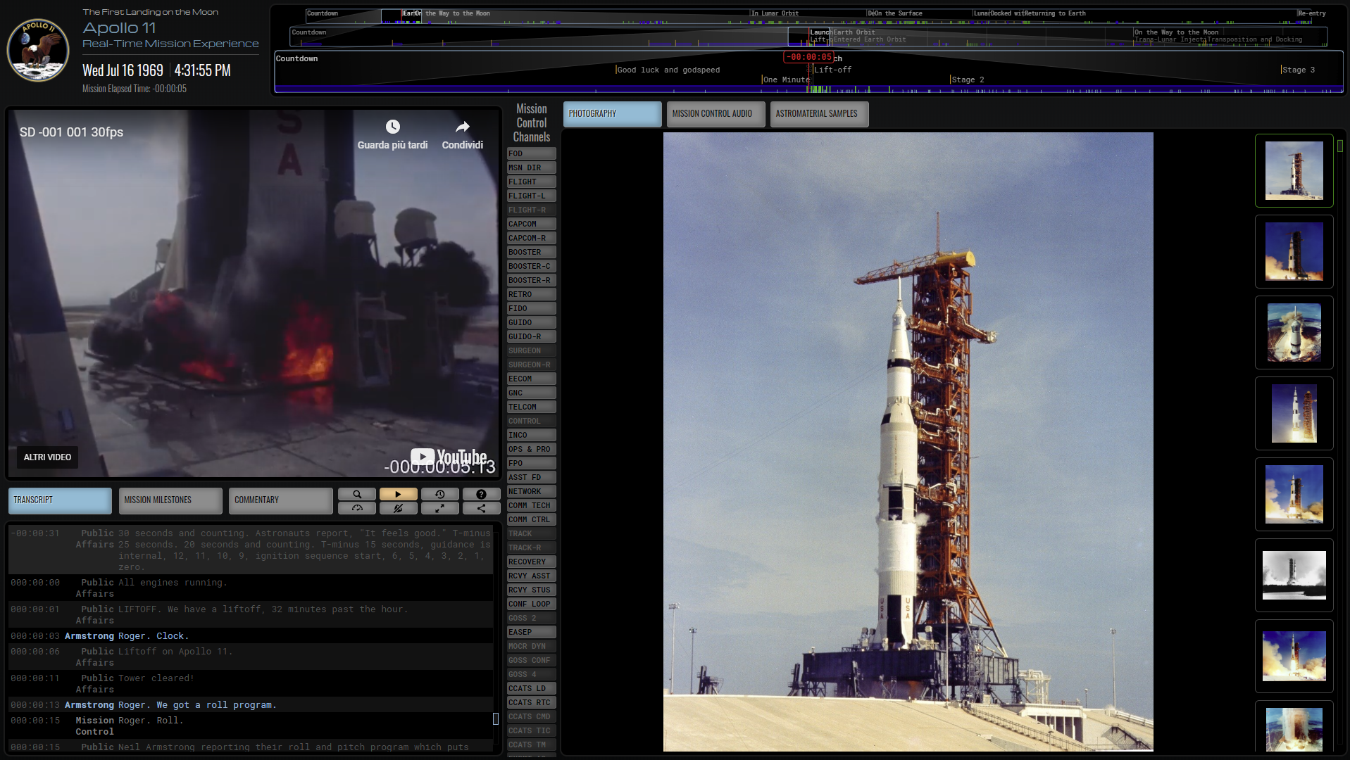 La missione Apollo 11, minuto per minuto, proprio come se fossimo al Centro Controllo e potessimo spostarci da una postazione all’altra. Non solo, anche le riprese, le immagini, le trasmissioni televisive, e altro ancora… tutto sincronizzato e in successione nel tempo reale trascorso a terra.