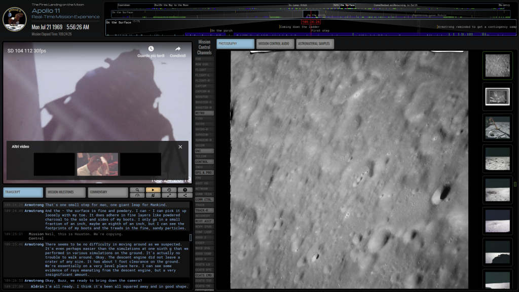 Si possono semplicemente seguire le conversazioni, lasciando scorrere il tempo e vedendo video e immagini come le vedevano loro in quel momento, oppure saltare da un canale all’altro (ben 50 canali diversi!), ascoltare le conversazioni tra il centro controllo e gli astronauti, o anche solo quelle dei tanti operatori a terra, che controllano lo stato di tutte le strumentazioni in gioco (le telemetrie… ricordiamo una serie di articoli che stiamo pubblicando in questi numeri, di Stefano Capretti, che ci spiegano proprio l’importanza e come funziona la telemetria di una sonda). O ancora, fare l’operazione contraria, e scegliere un’immagine o un video e venire trasportati nell’esatto momento in cui è stata scattata… ascoltando quello che si stavano dicendo.