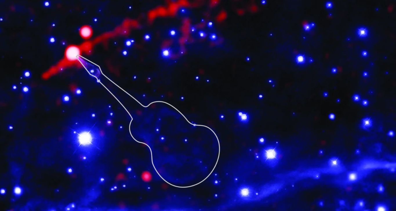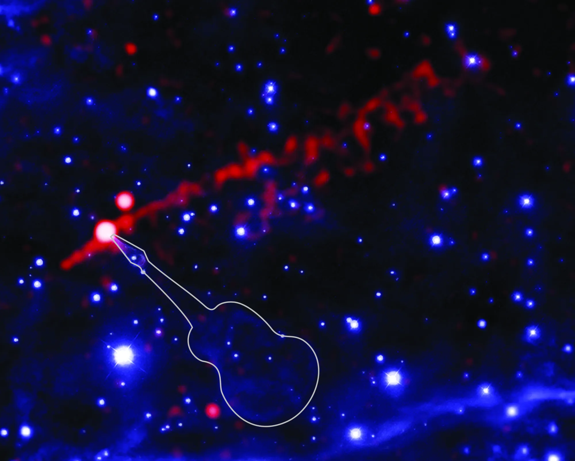 Al vertice della “chitarra” si trova la pulsar, una stella di neutroni in rapida rotazione, residuo del collasso di una stella massiccia. Mentre si muove nello spazio, la pulsar emette un filamento di particelle e luce X, catturato da Chandra, che si estende per circa due anni luce. Questo filamento ha mostrato variazioni nel corso di due decenni, come evidenziato dalle osservazioni di Chandra nel 2000, 2006, 2012 e 2021.