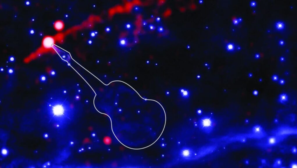 Gli astronomi hanno recentemente osservato un oggetto cosmico straordinario, soprannominato Nebulosa Chitarra, utilizzando i telescopi spaziali Chandra e Hubble della NASA. Questa struttura, associata alla pulsar PSR B2224+65, deve il suo nome alla somiglianza con una chitarra, visibile nella luce dell’idrogeno incandescente. La forma caratteristica deriva da bolle create dalle particelle espulse dalla pulsar PSR B2224+65 attraverso un vento costante.