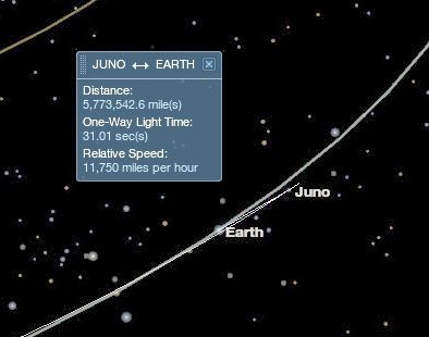 Non sarà l’ultima foto di casa che riprenderà di qui al 4 luglio 2016, giorno in cui arriverà al sistema gioviano: la Juno tornerà nei pressi della Terra il 9 ottobre 2013, per l’assist che dovrà accelerare la sua velocità di 7,3 km/sec, necessari per oltrepassare la Fascia degli Asteroidi. Un’ultima occasione per una nostalgica foto di casa prima di lanciarsi verso Giove.