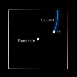 S2 infatti orbita attorno al buco nero ogni 16 anni, in un’orbita molto eccentrica che la porta entro venti miliardi di chilometri – 120 volte la distanza tra la Terra e il Sole, o circa quattro volte la distanza dal Sole a Nettuno – nel suo approccio più vicino al buco nero (questa distanza corrisponde a circa 1500 volte il raggio di Schwarzschild del buco nero stesso).