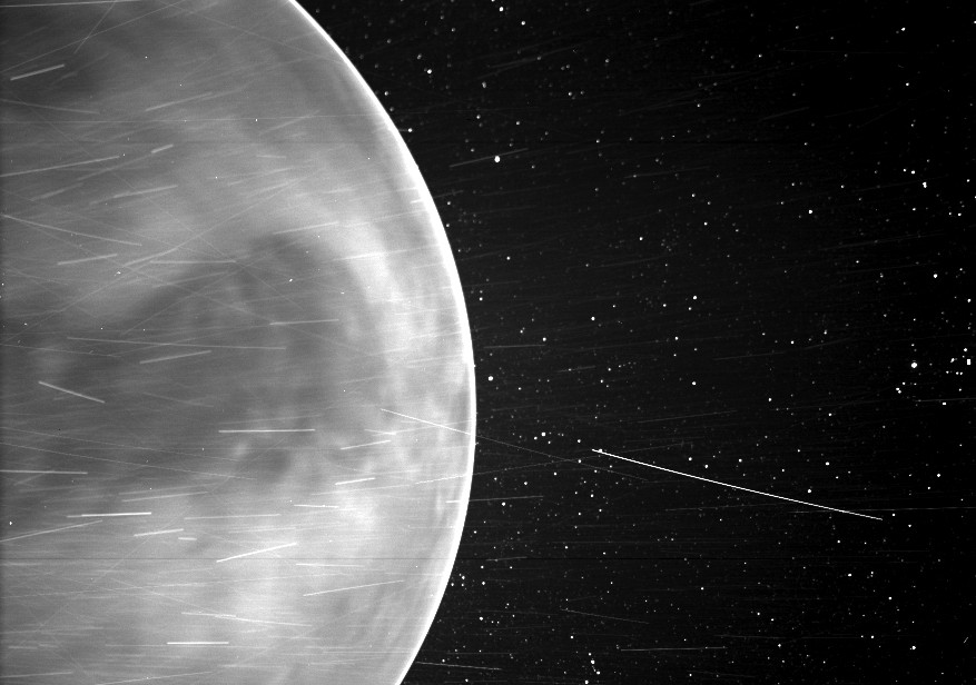 Ritornando al ritratto, sposando lo sguardo verso i margini del pianeta è visibile un alone luminoso che circonda tutta la semicirconferenza: probabilmente il bagliore notturno (nightglow, in inglese) prodotto dall’emissione di atomi di ossigeno nello stato eccitato che si ricombinano in molecole nelle parti superiori dell’atmosfera venusiana. Le scie luminose in tutta l’immagine sono invece probabilmente dovute a particelle cariche di energia e alla polvere vicino alla fotocamera che riflettono la luce solare. L’ultimo dei dettagli degni di nota lo si scorge in basso a destra: sono le stelle della cintura e della spada di Orione, i componenti della omonima costellazione di Orione, uno degli asterismi più conosciuti del cielo.
