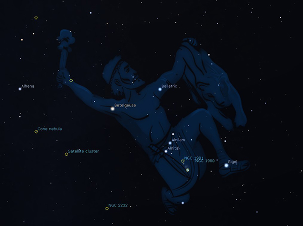 Nella parte superiore della costellazione brilla con la sua luce arancio la stella Betelgeuse, una supergigante rossa grande quasi 1000 volte più del Sole e distante circa 600 anni luce dalla Terra. L’astro è un oggetto al centro dell’interesse degli astronomi già da diversi anni, costantemente monitorato e studiato poiché alla fine del suo ciclo vitale potrebbe esplodere in supernova.
