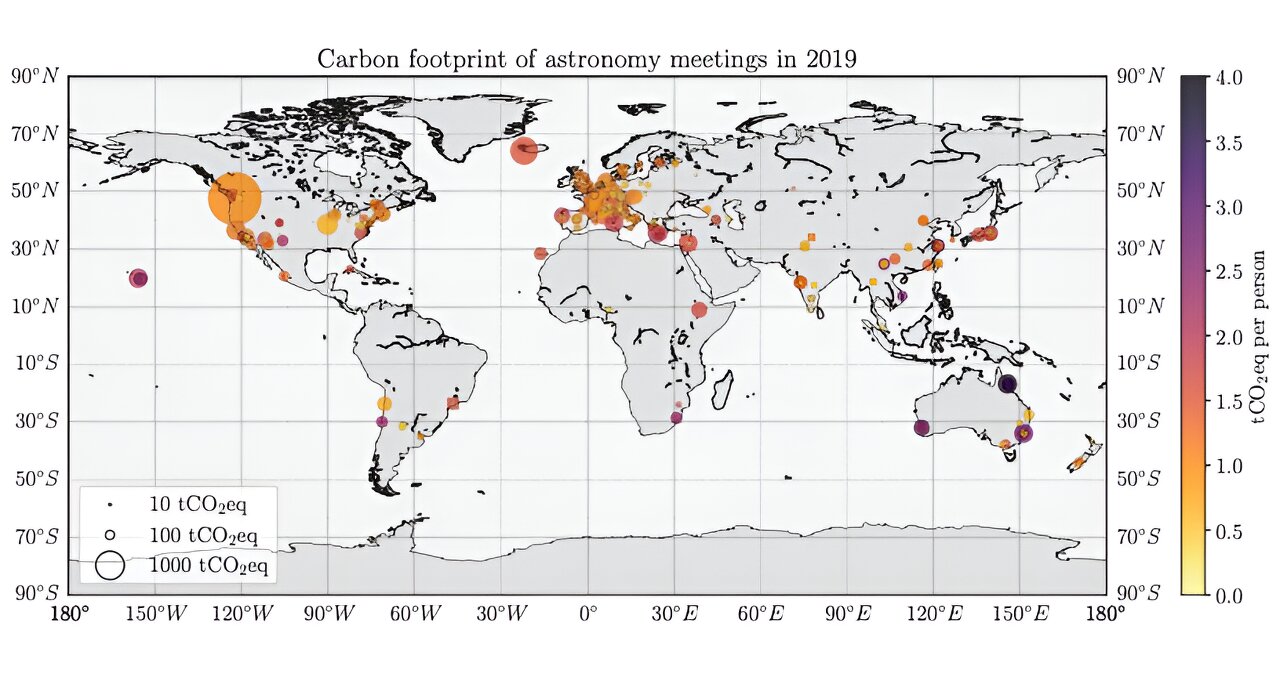 Nel 2019, i viaggi globali per partecipare a conferenze accademiche internazionali nel campo dell’astronomia hanno causato l’equivalente di 42.500 tonnellate di emissioni di CO2 dannose per il clima. Ciò equivale in media a una tonnellata di CO 2 per partecipante e conferenza. La distanza totale percorsa ammonta a una somma davvero astronomica: una volta e mezza la distanza tra la Terra e il sole.