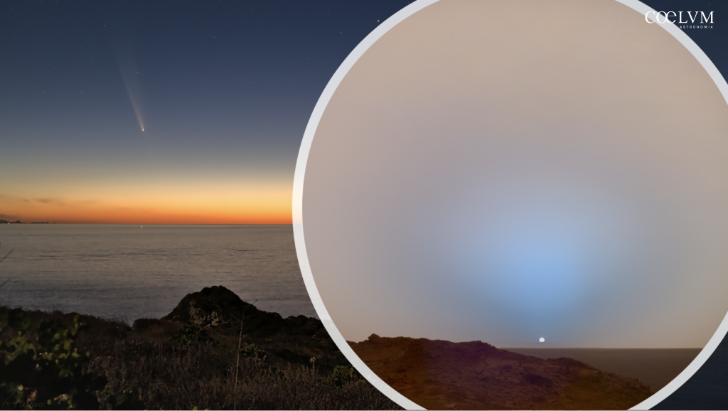 Collage. Immagine a sinistra: Cometa C/2023 A3, fotografata da Capo Milazzo al tramonto il 13 ottobre 2024 da Vincenzo Russo per Coelum e pubblicata su questo sito web l’11 dicembre 2024. Immagine a destra: foto del tramonto sul Cratere Gusev scattata il 19 maggio 2005 dal Rover Spirit (NASA)
