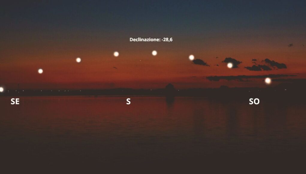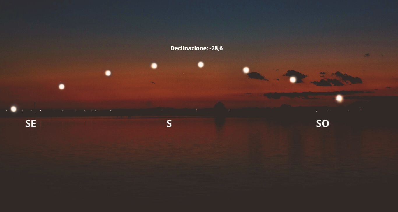 Dopo il Lunistizio maggiore settentrionale del 7 marzo, abbiamo assistito a quello meridionale: la Luna è sorta nel punto più meridionale degli ultimi 18,6 anni raggiungendo la declinazione di -28,64° e tramontando percorrendo un arco molto basso. La Luna ha raggiunto al culmine la declinazione più bassa degli ultimi 18,6 anni, ovvero dallo stesso luogo di osservazione non è mai vista così bassa negli ultimi due decenni, e dovremo attendere altrettanto perché l’evento si ripeta!