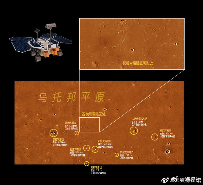 Qui sopra, una mappa aggiornata del luogo di atterraggio ripreso dall’orbiter, le nuove coordinate di Zhurong sono 25,1° N, 109,9° E, circa 50 km più a nord della posizione inizialmente prevista. In pratica il rover si torva a circa 1700 km dal luogo in cui si è posato il lander Viking-2 nel 1976, sempre in Utopia Planitia ma decisamente più a Nord. Inoltre, il rover cinese si trova a oltre 2300 km da Curiosity e oltre 1800 km da Perseverance, gli altri due robot funzionanti su Marte; di conseguenza, non c’è alcuna speranza (o timore) che si possano mai incontrare!
