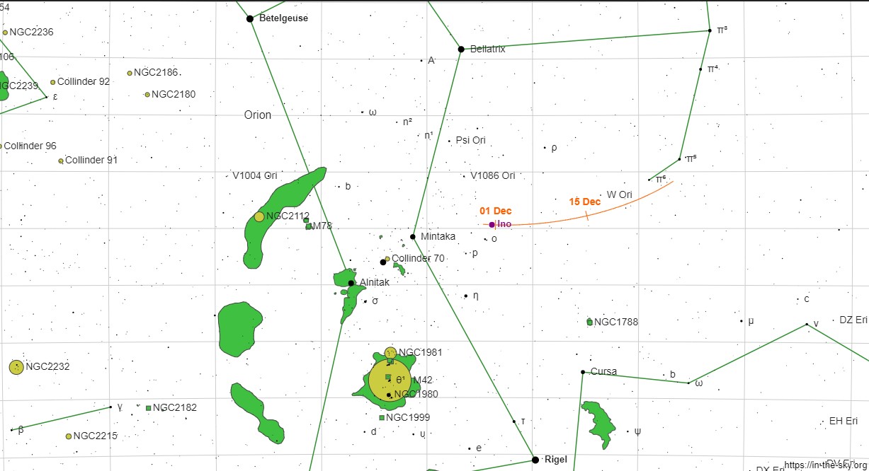 (173) Ino è un asteroide di fascia principale che compie un’orbita intorno al Sole ogni 1.660 giorni (4.54 anni) ad una distanza compresa tra le 2.17 e le 3.32 unità astronomiche (rispettivamente, 324.627.379 Km al perielio e 496.664.931 Km all’afelio). E’ stato così chiamato in onore di Ino, mitica figlia di Cadmo e di Armonia e moglie del re tebano Atamante. Scoperto da Alphonse Borrelly il 1 Agosto 1877, questo grande asteroide di 150 Kilometri di diametro è considerato il corpo progenitore dell’omonima famiglia asteoridale che conta all’incirca 460 membri. (173) Ino sarà in opposizione il 9 del mese. In questo frangente raggiungerà la massima brillantezza con una magnitudine di 11.3, il suo moto sarà di 0,61 secondi d’arco al minuto, quindi, per far si che l’oggetto mantenga un aspetto puntiforme nelle nostre immagini potremo utilizzare tempi di esposizione fino a 5 minuti. Per ottenere una traccia di movimento dovremo esporre (o integrare) per un tempo più lungo, e con 40 minuti di posa vedremo (173) Ino trasformarsi in una bella striscia luminosa di 24 secondi d’arco.