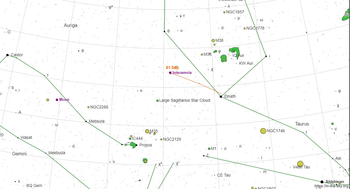 (704) Interamnia è un asteroide di fascia principale che compie un’orbita intorno al Sole ogni 1.950 giorni (5.34 anni) ad una distanza compresa tra le 2.58 e le 3.53 unità astronomiche (rispettivamente, 385.962.506 Km al perielio e 528.080.484 Km all’afelio). Deve il suo nome alla città di Teramo, dove fu scoperto il 2 Ottobre 1910 da Vincenzo Cerulli. Il quinto per dimensioni dopo Cerere, Vesta, Pallas e Hygiea, questo imponente asteroide (circa 330 Km di diametro) sarà in opposizione il 17 Dicembre, momento nel quale raggiungerà la massima luminosità brillando di magnitudine di 10.2. Il suo moto sarà di 0,64 secondi d’arco al minuto, quindi, per far si che l’oggetto mantenga l’aspetto puntiforme nelle nostre immagini utilizzeremo tempi di esposizione fino a 5 minuti. Per ottenere una traccia di movimento dovremo esporre (o integrare) per un tempo più lungo, e con 40 minuti di posa vedremo (704) Interamnia trasformarsi in una bella striscia luminosa di 25 secondi d’arco.