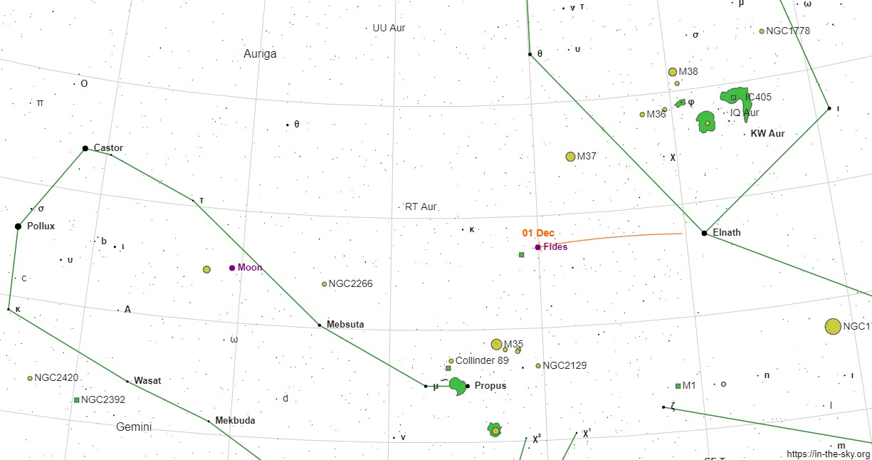 (37) Fides è un asteroide di fascia principale che compie un’orbita intorno al Sole ogni 1.570 giorni (4.30 anni) ad una distanza compresa tra le 2.18 e le 3.11 unità astronomiche (rispettivamente, 326.123.358 Km al perielio e 465.249.378 Km all’afelio). E’ stato così chiamato in onore di Fides, nella mitologia romana dea della fedeltà, della lealtà e della buona fede. Scoperto da Karl Theodor Robert Luther il 5 di Ottobre del 1855, Fides è un asteroide con un diametro stimato di circa 108 chilometri ed è classificato come un asteroide di tipo S, che indica una composizione principalmente rocciosa, con altri elementi come ferro e nichel. (37) Fides sarà in opposizione il 18 Dicembre, brillando ad una magnitudine di 9.8. Il suo moto sarà di 0,61 secondi d’arco al minuto, quindi, anche nel suo caso, con tempi di esposizione fino a 5 minuti ne preserveremo l’aspetto puntiforme. Volendo ottenere una traccia di movimento dovremo esporre (o integrare) per un tempo più lungo, e con 40 minuti di posa vedremo (37) Fides trasformarsi in una bella striscia luminosa di 24 secondi d’arco.