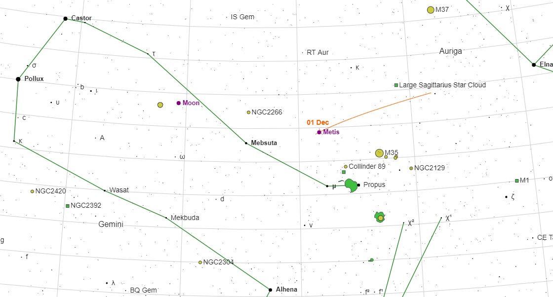 (9) Metis è un asteroide di fascia principale che compie un’orbita intorno al Sole ogni 1.350 giorni (3.70 anni) ad una distanza compresa tra le 2.09 e le 2.68 unità astronomiche (rispettivamente, 312.659.550 Km al perielio e 400.922.293 Km all’afelio). Deve il suo nome a Meti, Figlia di Teti e Oceano, divinità personificazione della prudenza. Scoperto da Andrew Graham il 25 aprile 1848, questo imponente asteroide (circa 190 Km di diametro) sarà in opposizione il 22 Dicembre, momento nel quale raggiungerà la massima luminosità brillando di magnitudine di 8.4. Il suo moto sarà di 0,68 secondi d’arco al minuto, quindi, per far si che l’oggetto mantenga un aspetto puntiforme nelle nostre immagini potremo utilizzare tempi di esposizione fino a 5 minuti. Per ottenere una traccia di movimento dovremo esporre (o integrare) per un tempo più lungo, e con 40 minuti di posa vedremo (9) Metis trasformarsi in una bella striscia luminosa di 27 secondi d’arco.