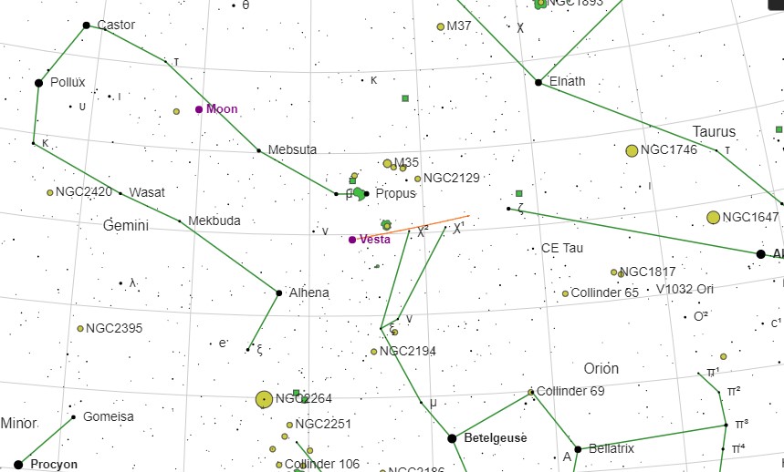 (4) Vesta è il secondo Asteroide per dimensioni (circa 525 Km di diametro) della fascia principale, secondo solamente a (1) Cerere. Compie un’orbita intorno al Sole ogni 1.330 giorni (3.64 anni) ad una distanza compresa tra le 2.10 e le 2.57 unità astronomiche (rispettivamente, 321.635.422 Km al perielio e 384.466.528 Km all’afelio). Con picchi di magnitudine fino a 5.1, (4) Vesta è l’asteroide più brillante visibile dalla Terra ed è considerato il corpo progenitore della famiglia dei Vestoidi, un gruppo di asteroidi nato a seguito di collisioni risalenti a circa due miliardi di anni fa. Scoperto dall’astronomo Heinrich Olbers il 29 Marzo 1807, l’asteroide sarà in opposizione il 21 Dicembre, brillando ad una magnitudine di 6.4. Il suo moto sarà di 0,69 secondi d’arco al minuto, quindi con tempi di esposizione fino a 5 minuti ne potremo preservare l’aspetto puntiforme. Volendo ottenere una traccia di movimento dovremo esporre (o integrare) per un tempo più lungo, e con 40 minuti di posa vedremo (4) Vesta trasformarsi in una bella striscia luminosa di 27 secondi d’arco.