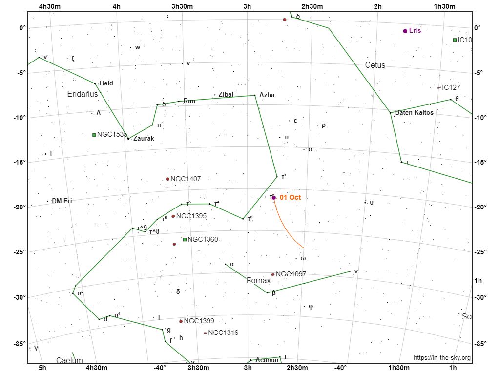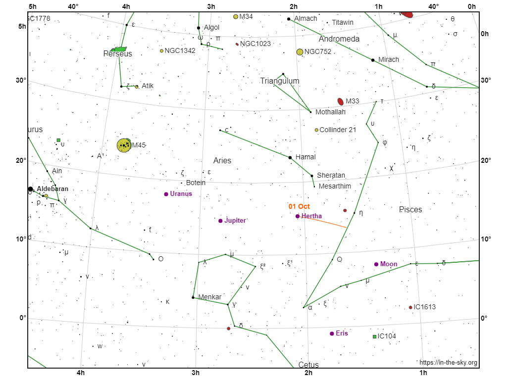 (135) Hertha è un asteroide di fascia principale che compie un’orbita intorno al Sole ogni 1.380 giorni (3.78 anni) ad una distanza compresa tra le 1.93 e le 2.93 unità astronomiche (rispettivamente, 288.723.890 Km al perielio e 438.321.761 Km all’afelio). Deve il suo nome a Hertha, Divinità germanica della fertilità. Scoperto da Christian Heinrich Friedrich Peters il 18 Febbraio 1874, questo grande asteroide di 80 Kilometri di diametro è annoverato tra i membri principali della famiglia asteroidale Nysa, anche se l’appartenenza effettiva a questa famiglia è tutt’ora incerta. (135) Hertha sarà in opposizione il 22 Ottobre. In questo frangente raggiungerà la massima brillantezza con una magnitudine di 10.5, il suo moto sarà di 0,65 secondi d’arco al minuto, quindi, per far si che l’oggetto mantenga un aspetto puntiforme nelle nostre immagini potremo utilizzare tempi di esposizione fino a 5 minuti. Per ottenere una traccia di movimento dovremo esporre (o integrare) per un tempo più lungo, e con 40 minuti di posa vedremo (135) Hertha trasformarsi in una bella striscia luminosa di 26 secondi d’arco.