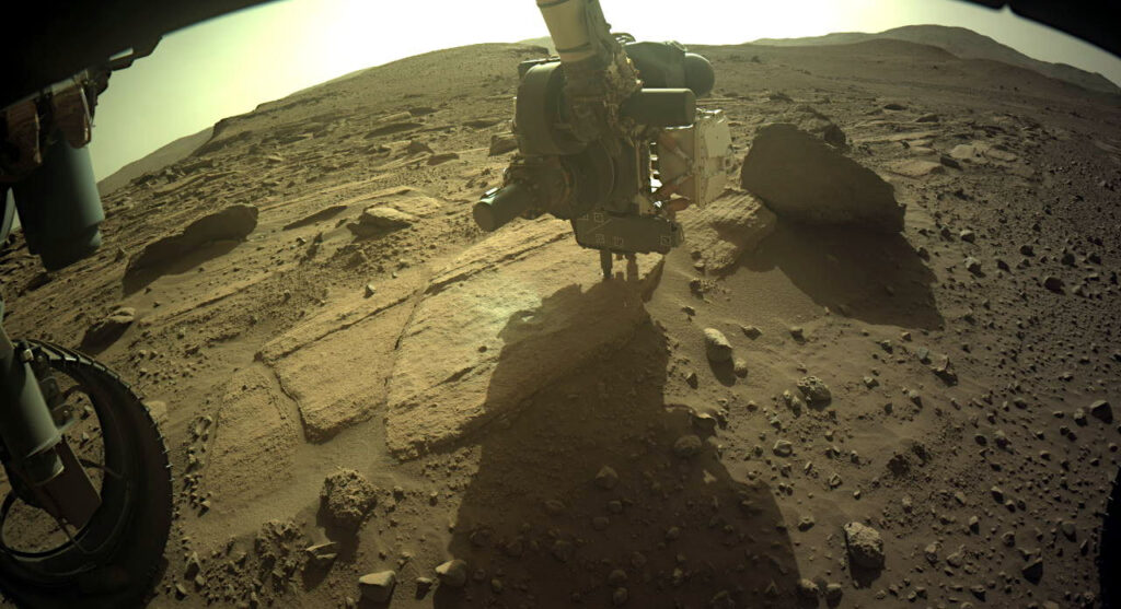 Abbiamo anche numerose foto a operazione conclusa scattate sia con le MastCam-Z che con le NavCam (entrambe ospitate sulla torretta del rover a circa 2 metri di altezza). L’elaborazione delle foto è risultata un po’ difficoltosa a causa dell’illuminazione in forte controluce, dovuta al fatto che Perseverance era rivolto verso ovest perfettamente in direzione del sole calante. Risulta più che evidente il campione di roccia all’interno della punta cava del trapano.
