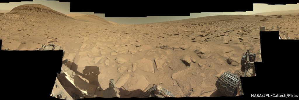Il mese di maggio, per il veterano dei rover, ha visto alcuni brevi spostamenti finalizzati all’avvicinamento ad alcune rocce interessanti che sono state battezzate Ekeni, Fazendinha e Sao Miguel. In questa fase le investigazioni scientifiche hanno coinvolto numerosi strumenti: le MastCam con i loro filtri a banda stretta; la ChemCam grazie al suo laser; MAHLI, camera macro montata sul braccio robotico; APXS, spettrometro a raggi-X simile a PIXL di Perseverance. Curiosity è stato comandato anche per eseguire delle panoramiche della zona come questa a 360° che vi presento composta da 141 singole immagini.