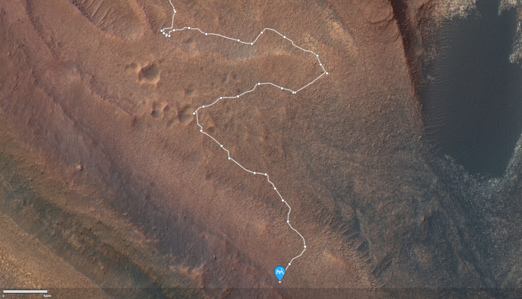 Il team che controlla il rover accetta di buon grado che Dragon’s Egg non vuole svelare troppo dei propri segreti, quindi dopo un ulteriore giorno di analisi il rover viene fatto spostare verso nord-ovest per indagare altre rocce, stavolta dei basamenti sedimentari già adocchiati da Ingenuity nel corso del volo 52, che si spera si rivelino più amichevoli.