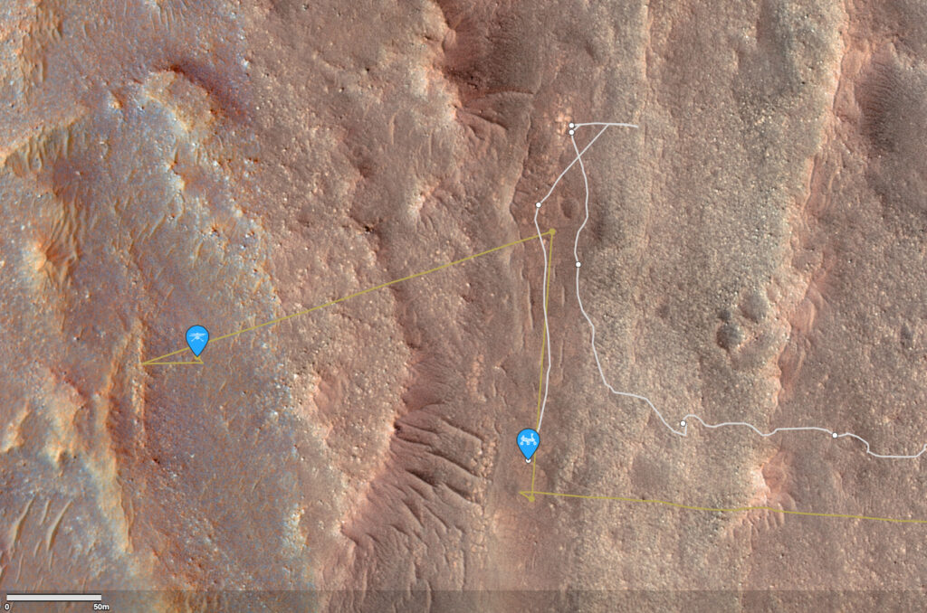 La nuova attività, la 54esima, ha avuto luogo il 3 agosto o Sol 872. A soli 50 metri di distanza si trovava Perseverance, così i tecnici non si sono fatti sfuggire l’occasione sia di fotografare l’elicottero che di filmarlo durante il breve volo in hovering sul posto.