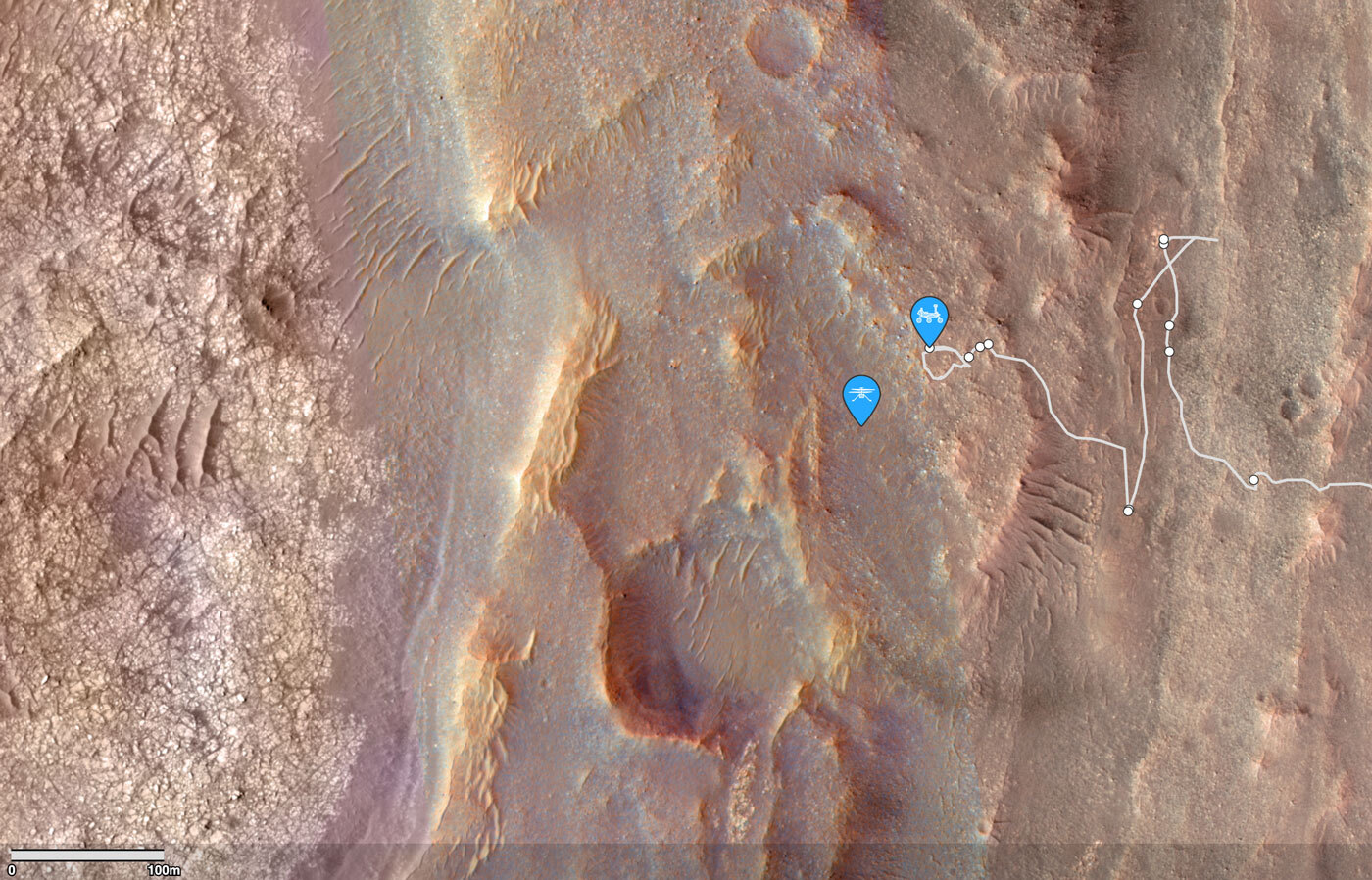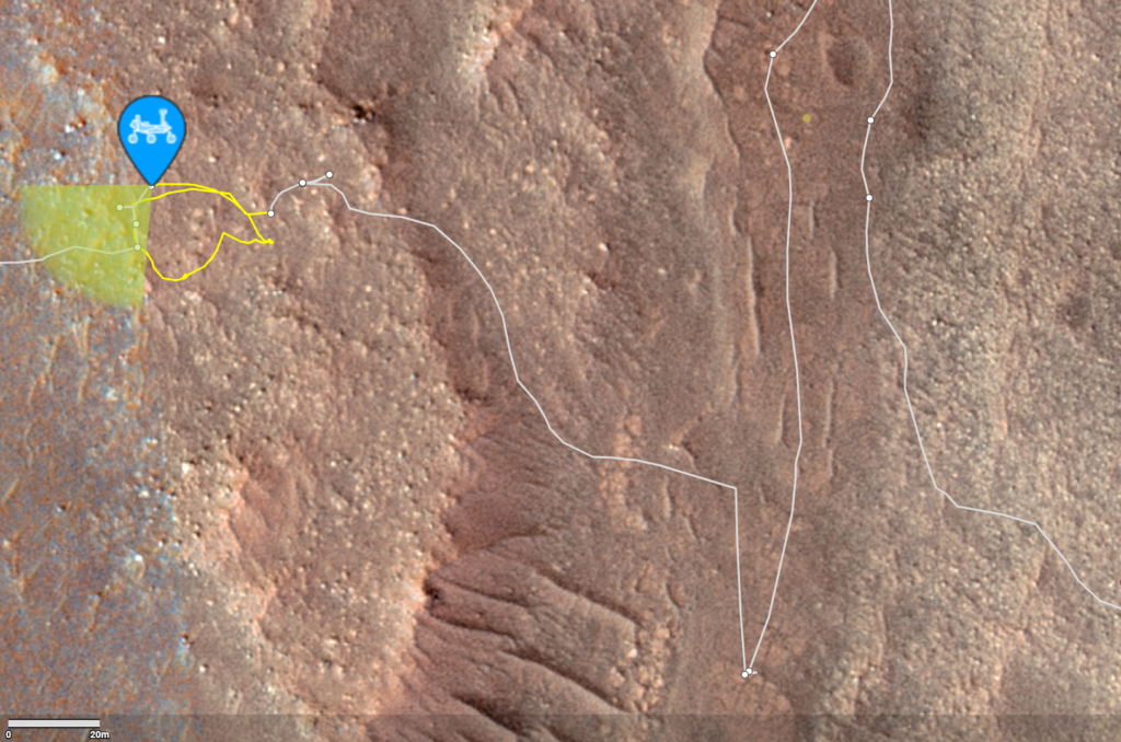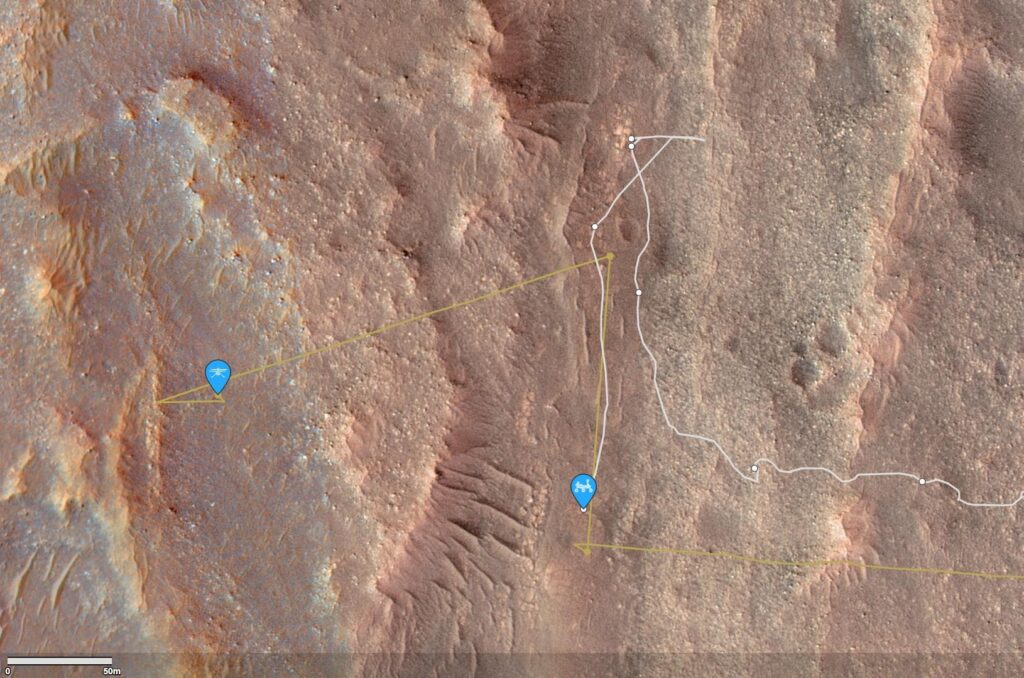 Lo spostamento (evidenziato in giallo nella mappa) è stato di 410 metri che sono stati percorsi in 2 minuti e 21 secondi, fornendo immagini aeree delle zone che il rover avrebbe raggiunto nelle settimane successive (linea bianca con il percorso di Perseverance).