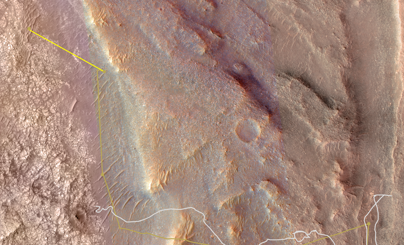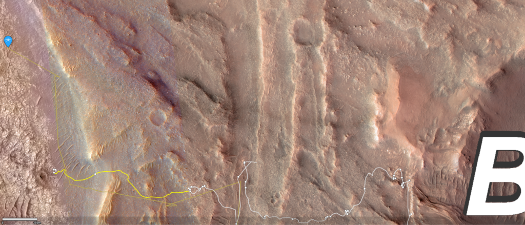Un po’ di contesto ci è fornito dall’immagine satellitare con sovraimposto il percorso effettuato sino ad ora da Curiosity.