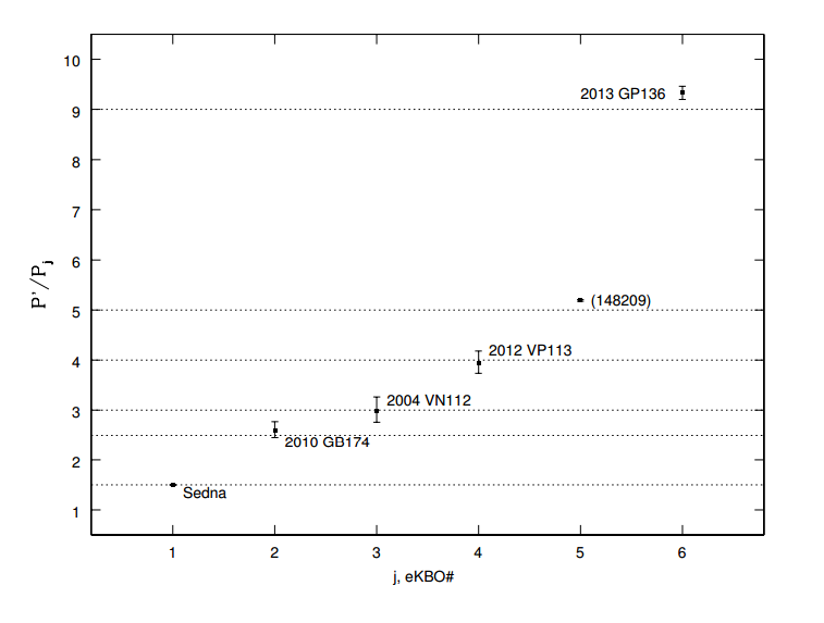 «Un sintomo dovuto alle risonanze orbitali è che i periodi orbitali dei KBO dovrebbero essere tra di loro pari a rapporti tra numeri interi piccoli,» scrivono i ricercatori. «Esaminando i periodi orbitali e ordinandoli dal più lungo a quello più corto (dunque ponendo il periodo di Sedna come primo), il rapporto tra il periodo di Sedna e quello degli altri cinque KBO risulta essere, rispettivamente: 1.596, 1.993, 2.666, 3.303, 6.115». Questi valori sono sufficientemente vicini ai rapporti 8/5, 2/1, 8/3, 10/3 e 6/1 da aver spinto i ricercatori a proseguire le loro analisi. I loro semiassi maggiori e l’incertezza associata sono i seguenti: 506.84 ± 0.51, 350.7 ± 4.7, 319.6 ± 6.0, 265.8 ± 3.3, 221.59 ± 0.16, 149.84 ± 0.47. Successivamente, sono stati valutati tre scenari di risonanza orbitale tra Sedna e l’ipotetico nono pianeta: 2/1, 3/2 e 4/3. Le simulazioni mostrano che il caso più interessante è senza dubbio quello di una risonanza orbitale 3 a 2, la quale produce risonanze 5/2, 3/1, 4/1, 5/1 e 9/1 per gli altri cinque oggetti.