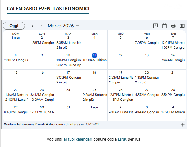 Il calendario ha quindi lo scopo di offrire un riferimento cronologico utile per individuare gli eventi di interesse e pianificare con anticipo una sessione osservativa o fotografica. Per valutare con precisione altezza sull’orizzonte, visibilità locale e condizioni migliori di osservazione, è sempre consigliabile verificare la situazione tramite un software planetario impostato sulla propria località.