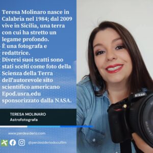 Teresa Molinaro si racconterà attraverso le sue foto (molte delle quali pubblicate anche su Coelum Astronomia, oltre che da riviste fotografiche e dal sito scientifico epod.usra.edu) e verrà intervistata da Paola e Andrea svelando aneddoti che sottolineano il suo stretto legame con il cielo e di come coniuga scienza e arte fotografica nei suoi lavori, collocando i fenomeni celesti in un contesto anche paesaggistico e territoriale.