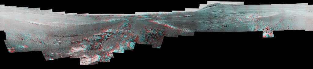 Nell’immagine intravediamo anche una porzione dei pannelli solari di Oppy – spesso visibili in questi panorami, in particolare quando comprendono immagini del terreno vicino al rover – e la cima dell’antenna a basso guadagno, con il quale il rover comunicava direttamente con le antenne del Deep Space Network, qui sulla Terra.