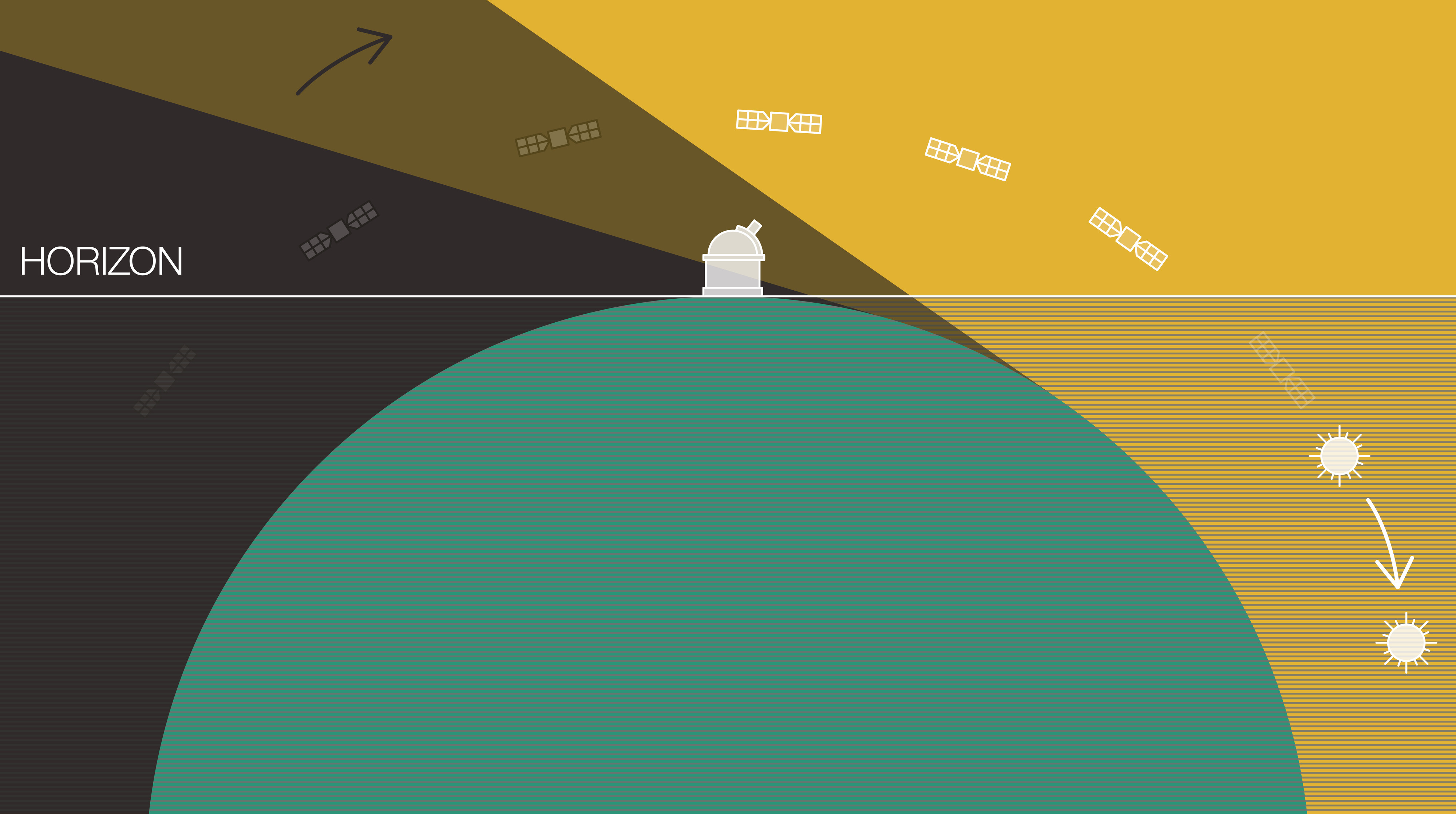 Per quanto riguarda l’orario delle osservazioni, ma anche l’osservazione del cielo a occhio nudo, mentre al tramonto e all’alba sarebbero tutti illuminati dal Sole, in realtà via via che ci si inoltra nella notte sempre più satelliti entrano nell’ombra della Terra. Dallo studio si rileva che fino a circa 100 satelliti potrebbero essere abbastanza luminosi da essere visibili a occhio nudo durante le ore del crepuscolo, circa 10 dei quali sarebbero più alti di 30 gradi di elevazione, ma diminuirebbero velocemente a mano a mano che la notte diventa più scura.