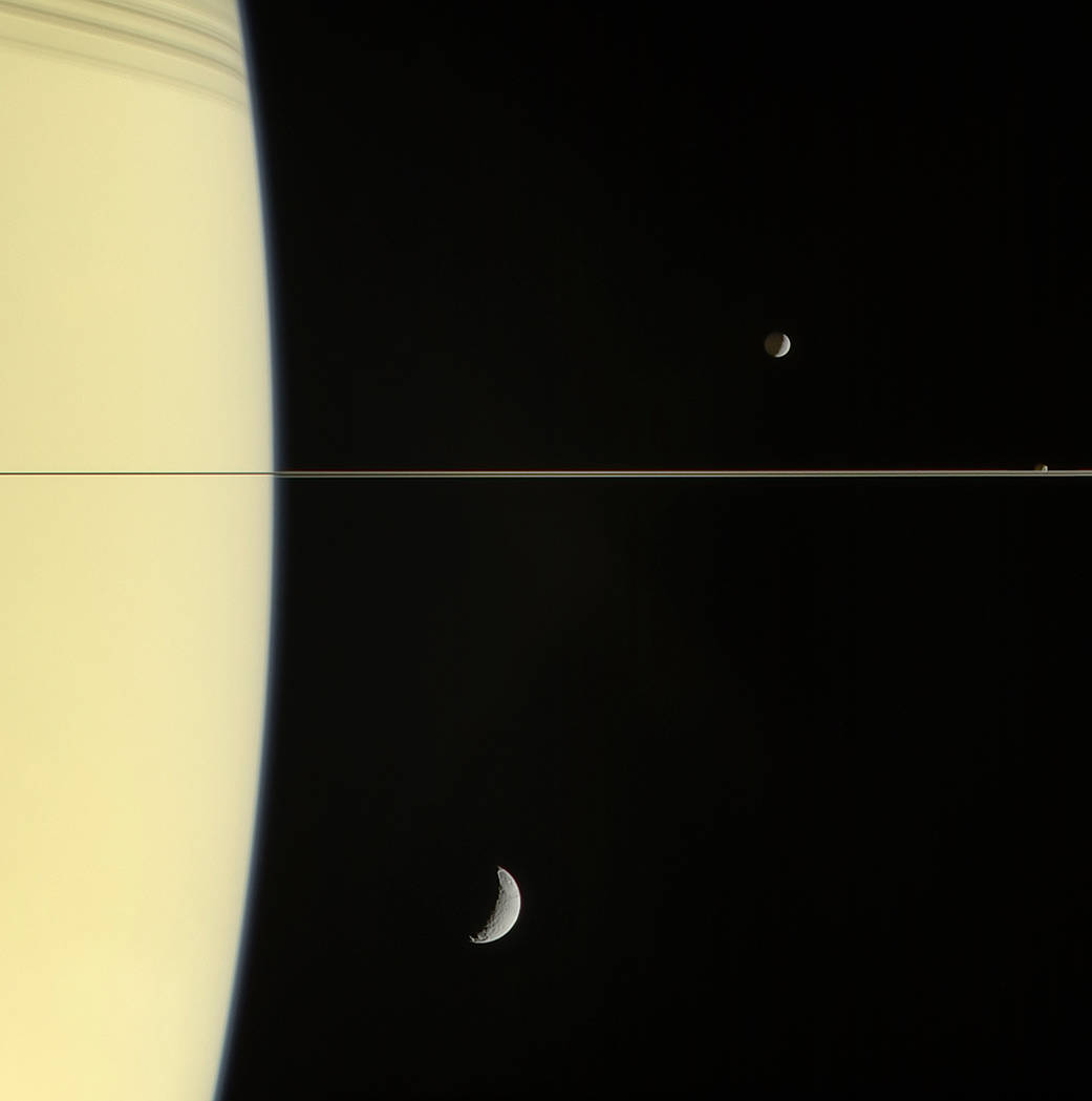 Il 13 marzo del 2006, la narrow-angle camera della sonda ha ripreso questa vista di Saturno con gli anelli presi praticamente quasi di taglio, in compagnia della sue lune Mimas e Janus (al di sopra del piano degli anelli) e Tethys (al di sotto). Attenzione che, in questo caso, “sopra” e “sotto” è solo una questione di prospettiva… poiché lune e anelli giacciono in realtà all’incirca sullo stesso piano.