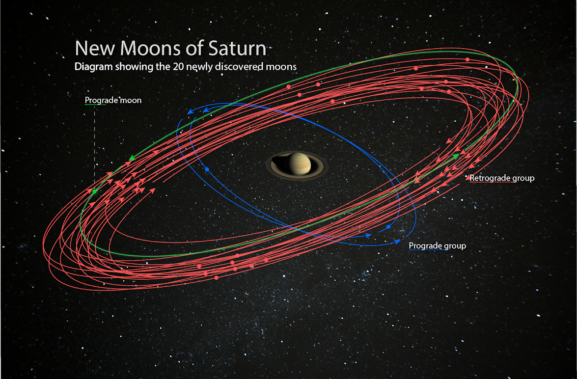 Ognuna delle nuove lune ha un diametro di circa 5 chilometri, 17 ruotano in senso inverso (retrogrado) rispetto al pianeta, mentre solo 3 orbitano nella stessa direzione della rotazione di Saturno. Due di queste sono le più vicine al sistema di anelli, e impiegano circa due anni per compiere un’orbita, le altre invece circa tre.