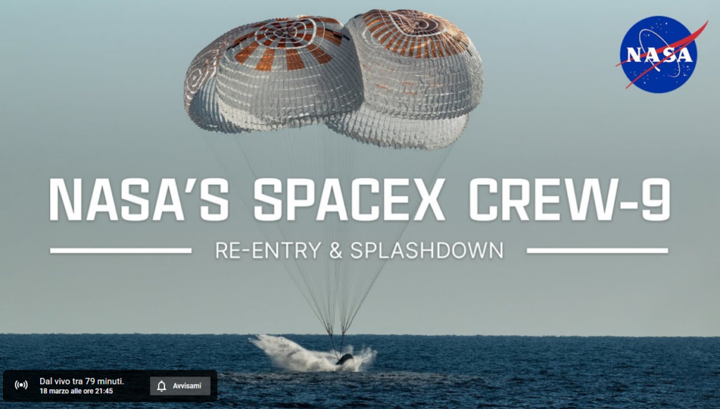 L’ammaraggio della Crew-9 sarà trasmesso in diretta sul canale ufficiale NASA di youtube https://www.youtube.com/watch?v=IDYt1l_7UvU