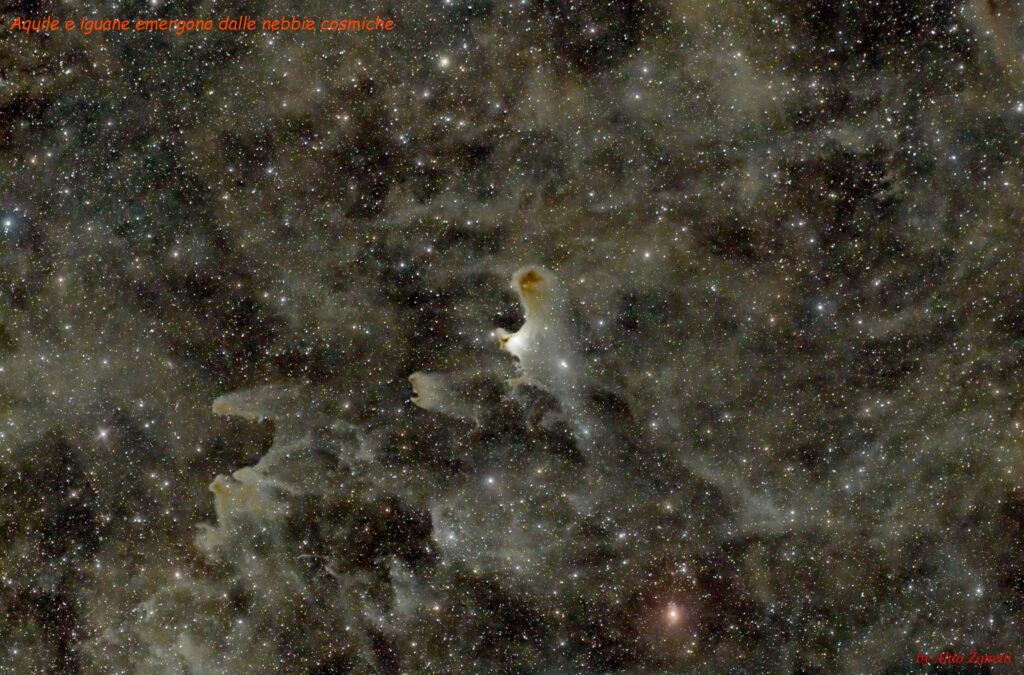 “Era parecchio tempo che volevo fare una buona ripresa di SH2-136, meglio conosciuta come la Ghost Nebula. Ero arrivato ad accumulare oltre 50 ore sotto il cielo della pianura padana, ma le luci che mi circondavano di Modena, Sassuolo, Rubiera introducevano gradienti difficilmente compatibili con la parte a riflessione della nebulosa. A luglio di due anni fa decisi di provare sotto un cielo più favorevole, e la scelta cadde su Forca Canapine, che numerosi amici astrofotografi mi avevano raccomandato per lo splendido cielo. Arrivai dopo un viaggio di 4 ore e mezzo di macchina, giusto in tempo per montare il setup e cominciare le riprese. Usavo un APO Askar FRA 600 a f/5.6 e una camera ASI2600MC, e cominciai a scattare a 300 secondi, con un gain di 150 e in bin 1. Uso ASIair per la guida, quindi controllato che tutto funzionasse a dovere mi gustai per un po’ un cielo che prometteva davvero bene, e vinto dalla stanchezza andai a riposare. La mattina dopo avevo 45 frame da integrare per cominciare a capire come procedere. Quando Pixinsight mi restituì l’immagine dopo la ripulitura del background per un po’ non riuscivo a crederci, poi proruppi in un grido di entusiasmo che risvegliò bruscamente gli amici che mi accompagnavano e che si fecero poi pagare la colazione per quello: avevo davanti agli occhi un’immagine fantastica, ricca di segnale come mai mi sarei aspettato! Non era neppure necessario fare altre notti di riprese, tanto forte era il segnale, ed infatti la notte dopo feci uno splendido Anello del Cigno, in due pannelli con la Velo e tutta la struttura circolare. Da allora sono un sostenitore acceso del cielo di Forca Canapine, ci vado per tutte le lune nuove che promettono un buon meteo, e mi ha fatto molto piacere quando per la luna nuova di maggio 2024 eravamo in 16 telescopi a fare foto da là”