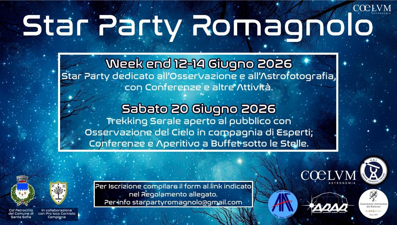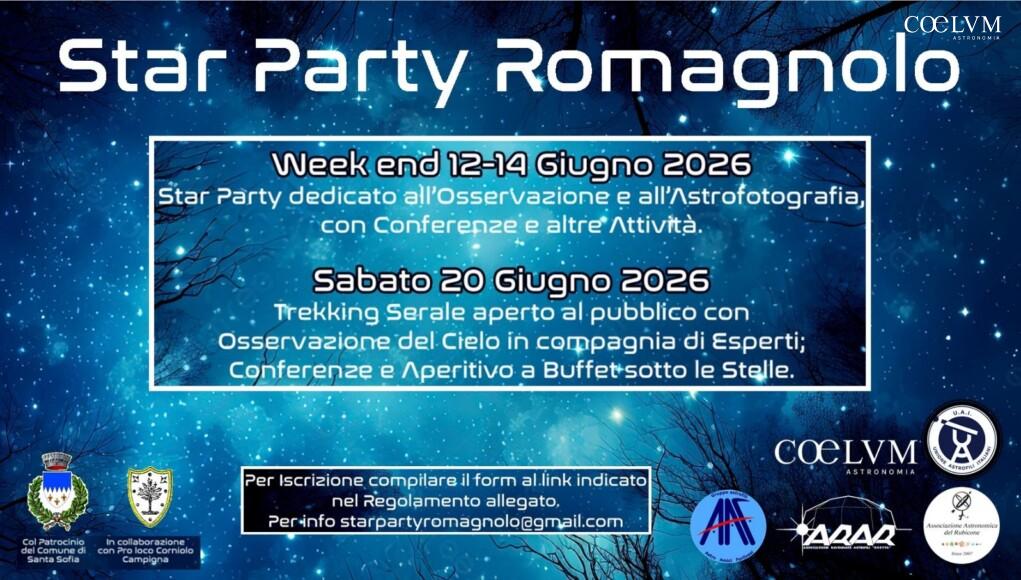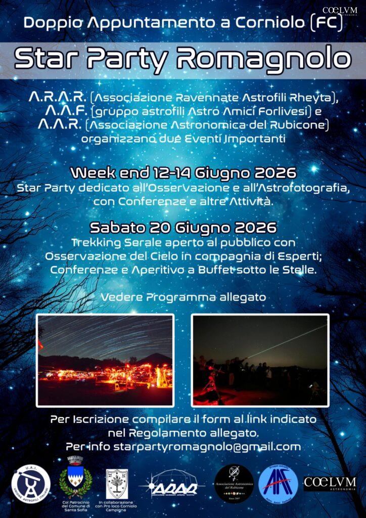 Corniolo (FC), giugno 2026 – Torna uno degli appuntamenti più attesi dagli appassionati di astronomia del territorio: lo Star Party Romagnolo 2026, organizzato congiuntamente da A.R.A.R. (Associazione Ravennate Astrofili Rheyta), A.A.F. (Astro Amici Forlivesi) e A.A.R. (Associazione Astronomica del Rubicone). L’iniziativa, aperta a visualisti, astrofotografi, fotografi e curiosi, si articolerà in due momenti distinti, con un programma che unisce osservazione del cielo, divulgazione scientifica e attività all’aria aperta.