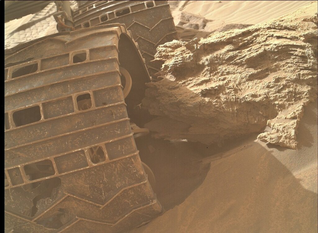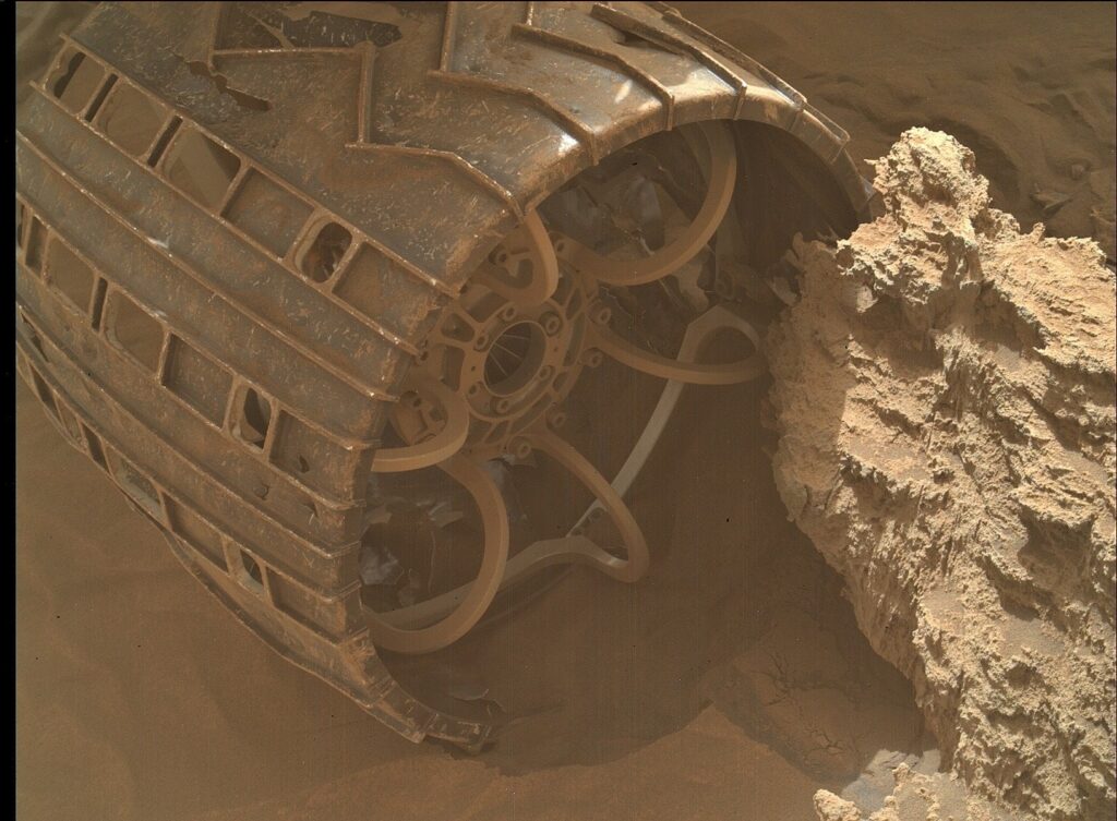 Giusto pochi giorni fa, il rover ha rischiato un incontro ravvicinato con alcune rocce affilate come rasoi. Situazione non inusuale sul pianeta rosso: già nel 2017 il passaggio su questa tipologia di rocce – definita “dorso di alligatore” – aveva comportato alcuni danni alle ruote, come si può notare nella foto. Sebbene questa tipologia di rocce non sia del tutto impraticabile, attraversare questo terreno avrebbe comportato un’usura maggiore delle ruote e minacciato la loro longevità. Così il team di piloti ha preferito tracciare un nuovo percorso sul Monte Sharp, la montagna di 5,5 km che Curiosity sta scalando dal 2014.