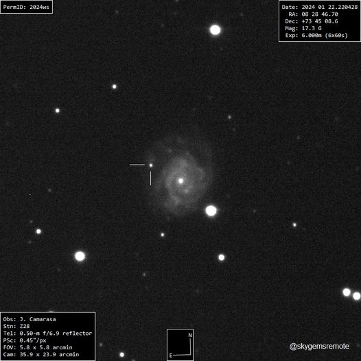 I cinesi del programma XOSS, che per tutto il 2023 hanno rivaleggiato a suon di scoperte con Itagaki, potevano rimanere impassibili di fronte alla doppietta del giapponese? Naturalmente no e anche loro hanno messo a segno due belle scoperte. La prima è stata effettuata nella notte del 10 gennaio nella piccola galassia PGC21981 posta nella costellazione della giraffa a circa 140 milioni di anni luce di distanza. Situata anche questa a soli 17 gradi dal Polo Nord celeste, PGC21981 è una galassia circumpolare e perciò visibile tutta la notte. Si trova inoltre a soli 3’ a Sud-Ovest dalla più appariscente galassia a spirale barrata NGC2441, che era in realtà il target principale della ripresa. Come abbiamo scritto altre volte è buona norma controllare sempre anche le galassie secondarie presenti nel campo di ripresa, perché potrebbero regalare grandi soddisfazioni come in questo caso. Al momento della scoperta il nuovo transiente mostrava una luminosità pari alla mag.+16,8 e nella notte del 15 gennaio ancora il nostro Claudio Balcon è riuscito a classificarla per primo nel TNS. La SN2024vs, questa la sigla definitiva assegnata, è una supernova di tipo II ed è quindi un altro target tutto amatoriale.