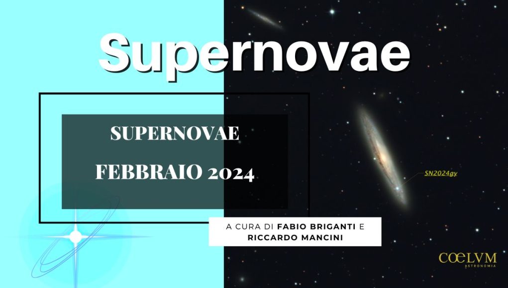 Concludiamo questa ricca rubrica con una scoperta italo-americana, che perciò ci riguarda più da vicino. Nella notte dell’11 gennaio gli astrofili Mirco Villi e Michele Mazzucato, che collaborano da diversi anni con i professionisti americani del CRTS Catalina, hanno individuato una debole stellina di mag.+18,9 analizzando immagini professionali realizzate con il telescopio Cassegrain di 1,5 metri di diametro dell’osservatorio americano sul Mount Lemmon in Arizona. La galassia ospite UGC6424 è una spirale vista di taglio, posta nella costellazione del Leone a circa 230 milioni di anni luce di distanza e situata a meno di due gradi a Nord dalla bella coppia di galassie Messier: M65 e M66. Nella notte del 17 gennaio dal Palomar Observatory in California con il telescopio da 1,5 metri è stato ottenuto lo spettro di conferma, che ha permesso di classificare il nuovo oggetto come una supernova di tipo II, assegnandole la sigla definitiva SN2024wp.