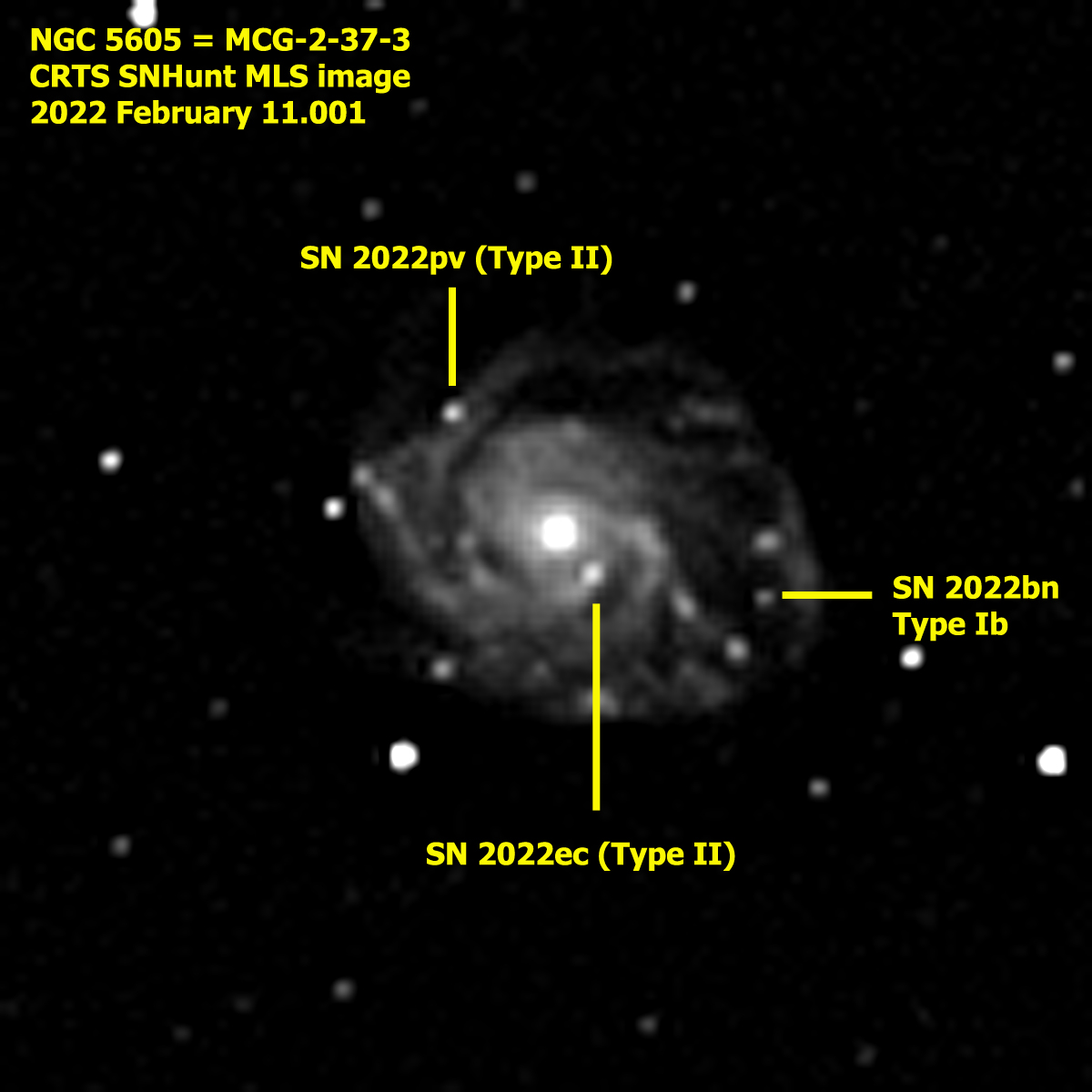 Concludiamo con una interessante curiosità. Esistono dei casi molto rari di due supernovae che esplodono contemporaneamente o quasi nella solita galassia, ne conosciamo circa una ventina. Ma il record assoluto che ha ottenuto la galassia a spirale barrata NGC5605, nella settimana dal 6 al 13 gennaio 2022, ha qualcosa di veramente incredibile e difficilmente replicabile. Ben tre supernovae visibili contemporaneamente in questa galassia posta nella costellazione della Bilancia a circa 170 milioni di anni luce di distanza. Sono state scoperte tutte e tre dal programma professionale americano di ricerca supernovae e pianetini denominato ATLAS Asteroid Terrestrial-impact Last Alert System.