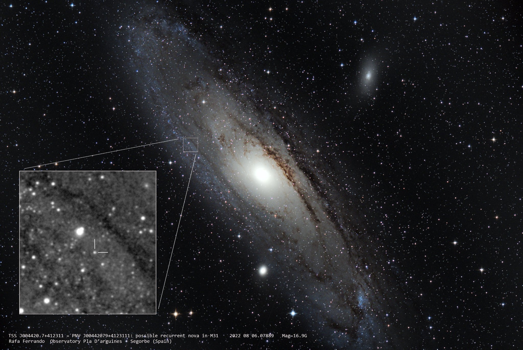 Quest’ultima scoperta è comunque molto importante per almeno un paio di motivi. Innanzi tutto si tratta di una Nova scoperta e classificata tutto in casa ISSP, infatti lo spettro di conferma dove erano ben visibili ed intense le righe di emissione di Balmer dell’idrogeno tipico delle Novae, è stato ottenuto dal bellunese Claudio Balcon che per primo è riuscito ad inserirlo nel Transient Name Server (TNS). L’altro motivo degno di grande interesse è dovuto al fatto che il team dell’Osservatorio di Monte Baldo si accorse subito della coincidenza della posizione della Nova da loro scoperta con la Nova M31N2005-10a scoperta l‘11 ottobre 2005 dagli astronomi americani del Mc Donald Observatory e dall’astrofilo italiano Marco Fiaschi (vedi Atel 627). Furono perciò avviati dei meticolosi controlli e con l’Atel 15545 astrofilo ceco Kamil Hornoch, riprendendo la Nova veronese l’8 agosto con il telescopio da 0,65 metri dell’Astronomical Institute di Odrejov, fugò ogni dubbio confermando la coincidenza della posizione. Si trattava pertanto di una Nova ricorrente, che sono le più seguite e studiate perché considerate potenziali candidate a diventare delle luminosissime supernovae di tipo Ia.