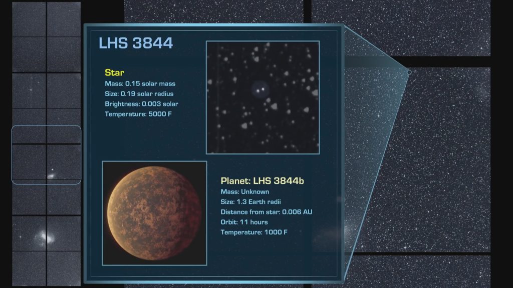Un altro pianeta roccioso, di dimensioni più simili al nostro, è stato trovato più a nord, nella costellazione dell’Indiano, attorno a una nana rossa grande circa un quinto del Sole, denominata LHS 3844, a 49 anni luce da noi. LHS 3884b ha diametro pari 1,3 quello terrestre, ma orbita vicinissimo alla stella, completando una rivoluzione in sole 11 ore. Secondo gli studiosi sul lato del pianeta esposto alla luce della stella la temperatura potrebbe superare i 500 gradi e vi si potrebbero formare laghi di lava fusa.